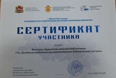 Філіял "Курынская сельская бібліятэка" ДУК "Віцебская раённая цэнтралізаваная бібліятэчная сістэма" стала пераможцам (1 месца) абласнога этапа XXXIII рэспубліканскага конкурсу "Бібліятэка – асяродак нацыянальнай культуры" ў намінацы "За навацыі ў сферы бібліятэчнай справы".