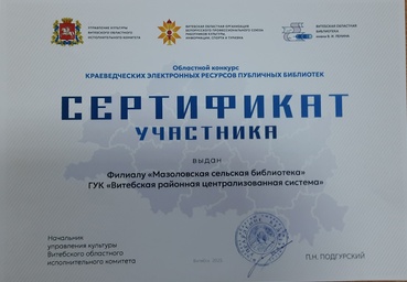 Філіял ”Альгоўская сельская бібліятэка“ удастоена дыплома 2 прэміі ў абласным конкурсе краязнаўчых электронных рэсурсаў публічных бібліятэк у намінацыі ”Слаўныя імёны Віцебшчыны“ за стварэнне краязнаўчага электроннага рэсурса ”Помнім кожнае імя...: настаўнікі і вучні Альгоўскай школы – удзельнікі Вялікай Айчыннай вайны“. Сертыфікаты ўдзельнікаў конкурсу атрымалі філіял ”Курынская сельская бібліятэка“ за відэаэкскурс ”Сівых муроў святая памяць“ (аб Свята-Мікалаеўскай царкве ў в. Курына) і філіял ”Мазалаўская сельская бібліятэка“ за стварэнне аўдыягіда ”Гісторыя Мазалава: ад маёнтка да аграгарадка“.